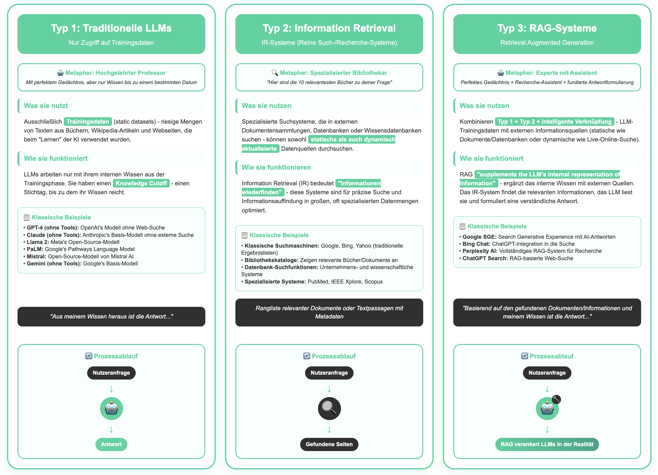 Diese Hybrid-Systeme kombinieren das Beste aus beiden Welten – sie nutzen Suchfunktionen, um aktuelle Informationen abzurufen, und verwenden dann LLM-Technologie, um diese zu einer verständlichen Antwort zu verarbeiten. Dadurch liefern sie dir präzisere, faktenbasierte und aktuelle Antworten, da sie sowohl auf statisches Training als auch auf dynamische Datenquellen zugreifen können.