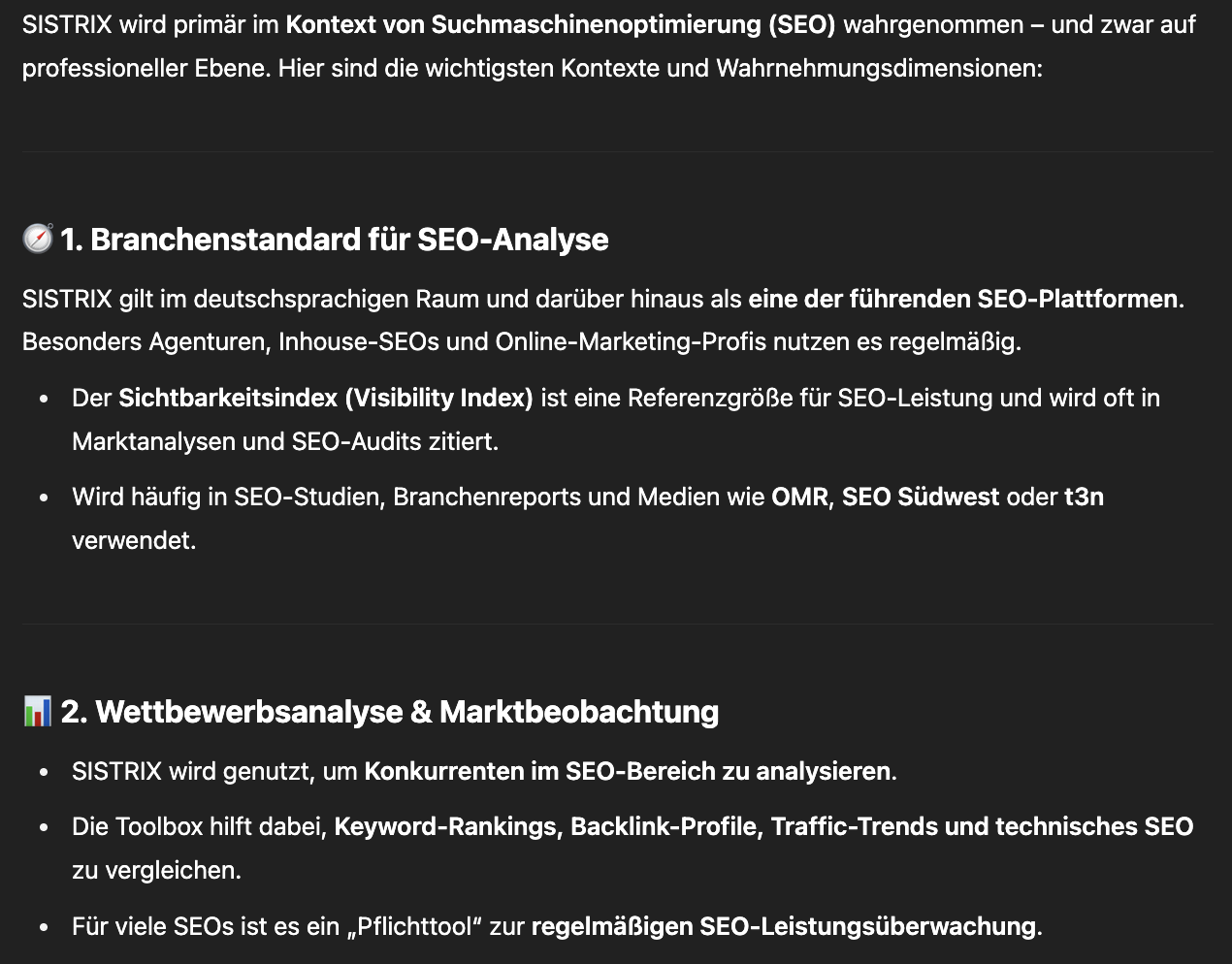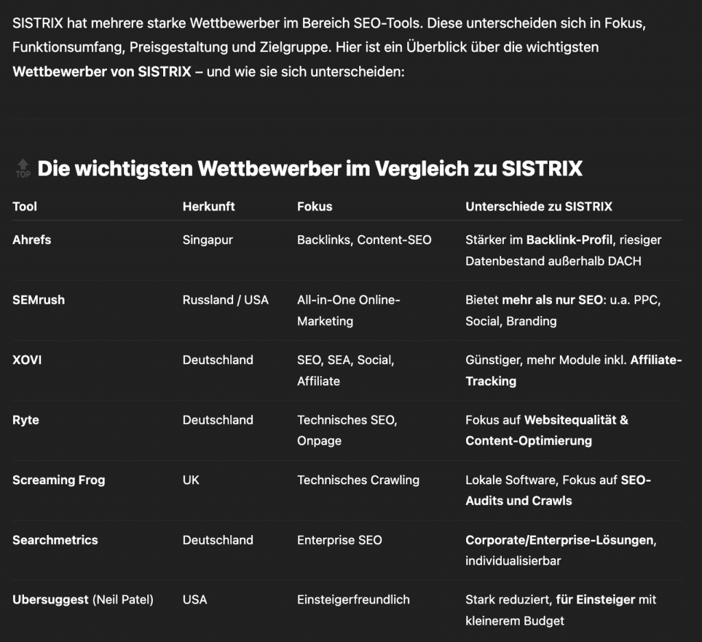 - Konkurrenzbeobachtung: Untersuche systematisch, welche Wettbewerber in LLM-Antworten zu deinen Kernthemen erscheinen und analysiere deren Strategien
