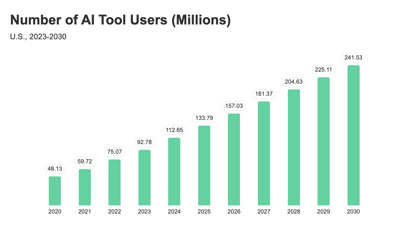 Laut Gartner-Prognosen könnte das Traffic-Volumen traditioneller Suchmaschinen bis 2026 um 25% sinken, da KI-gestützte Antworten an Bedeutung gewinnen (Searchengineland, 2024) [1]. Sichtbarkeit entsteht zunehmend nicht mehr allein über klassische Suchergebnisse. Aktuelle Daten von Statista zeigen zudem: Bereits 2023 nutzten 13 Millionen US-Amerikaner generative KI als ihr primäres Werkzeug für Online-Suchen – eine Zahl, die bis 2027 auf beeindruckende 90 Millionen ansteigen soll. Diese Entwicklung ist Teil eines größeren Trends: Die Gesamtzahl der KI-Tool-Nutzer in den USA wächst von 48 Millionen (2020) auf prognostizierte 241 Millionen (2030). Bereits heute nutzen 68% der US-Erwachsenen generative KI-Tools, um Antworten auf ihre Fragen zu finden – ein deutliches Signal dafür, dass sich das Suchverhalten fundamental wandelt. (Statista, 2024) [2]